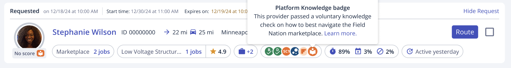 We have introduced a new badge on the Field Nation marketplace, the Field Nation Platform Knowledge Badge. Providers can receive the badge after completing a short set of learning modules and passing a voluntary knowledge check. This badge can help new providers win their first work orders faster by showing buyers they are engaged, informed, and confident in using the Field Nation platform.