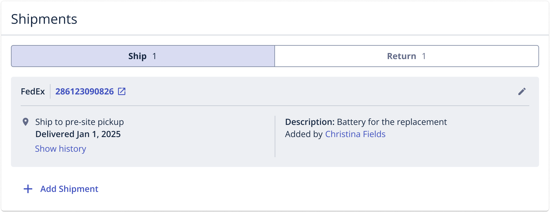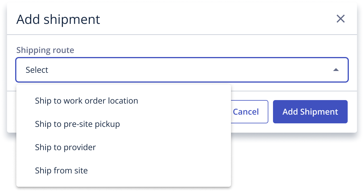 - We made several minor updates to the shipment options available when adding a shipment to a work order to improve clarity. Please note, this change does not impact integrations.