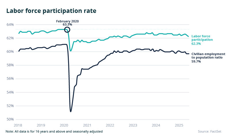 - Labor force participation remains below pre-pandemic levels, limiting the pool of experienced workers even as unemployment rises