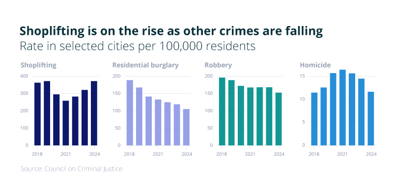 - Retailers reported a 19% increase in shoplifting and merchandise theft incidents from 2023 to 2024, according to an NRF study